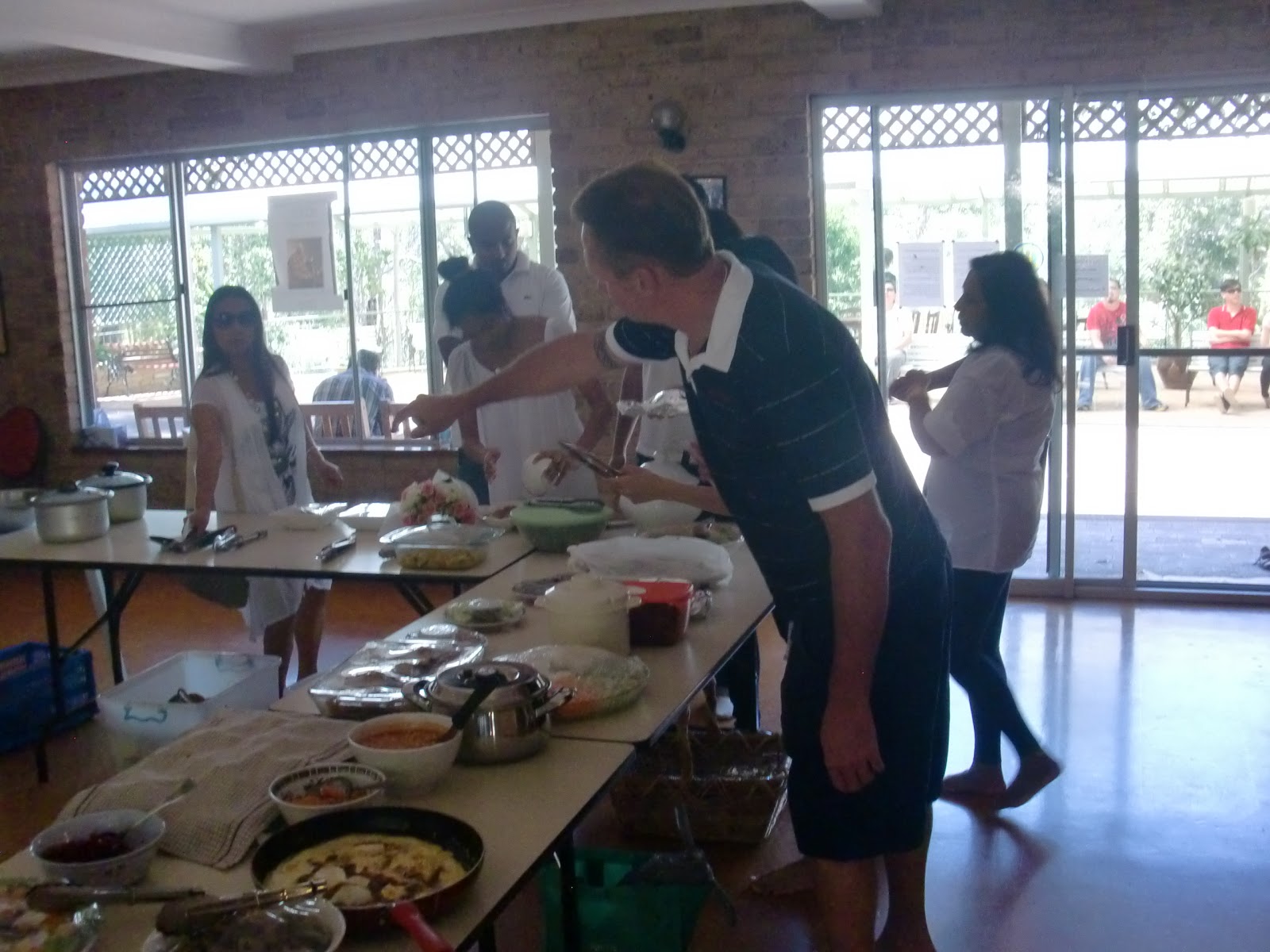 After the blessing, people would head downstairs to help themselves to a plate of food. Most of the monks usually ate silently upstairs in the dining hall, others would take the food back to their huts in the bush to eat in solitude. The guests and visitors would eat all around the monastery property, often in the outdoor courtyard.
